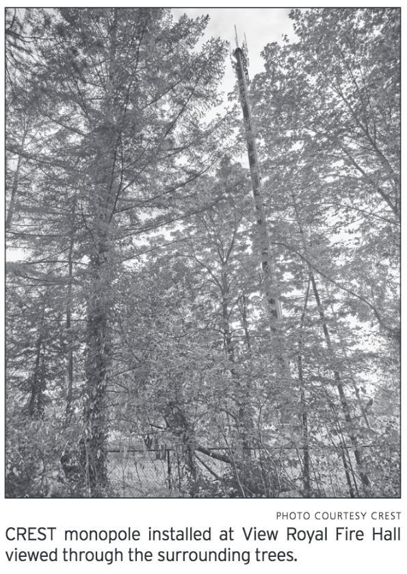 CREST monopole installed at View Royal Fire Hall viewed through the surrounding trees. – GI Driftwood (p.3) – November 20, 2019 2019-11-20 595 × 838 CREST monopole installed at View Royal Fire Hall viewed through the surrounding trees. – GI Driftwood (p.3) – November 20, 2019