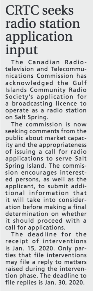 CRTC seeks radio station application input – Salt Spring Island, BC – GI Driftwood (p.3) – December 04, 2019 2019-12-05 312 × 972 CRTC seeks radio station application input – Salt Spring Island, BC – GI Driftwood (p.3) – December 04, 2019