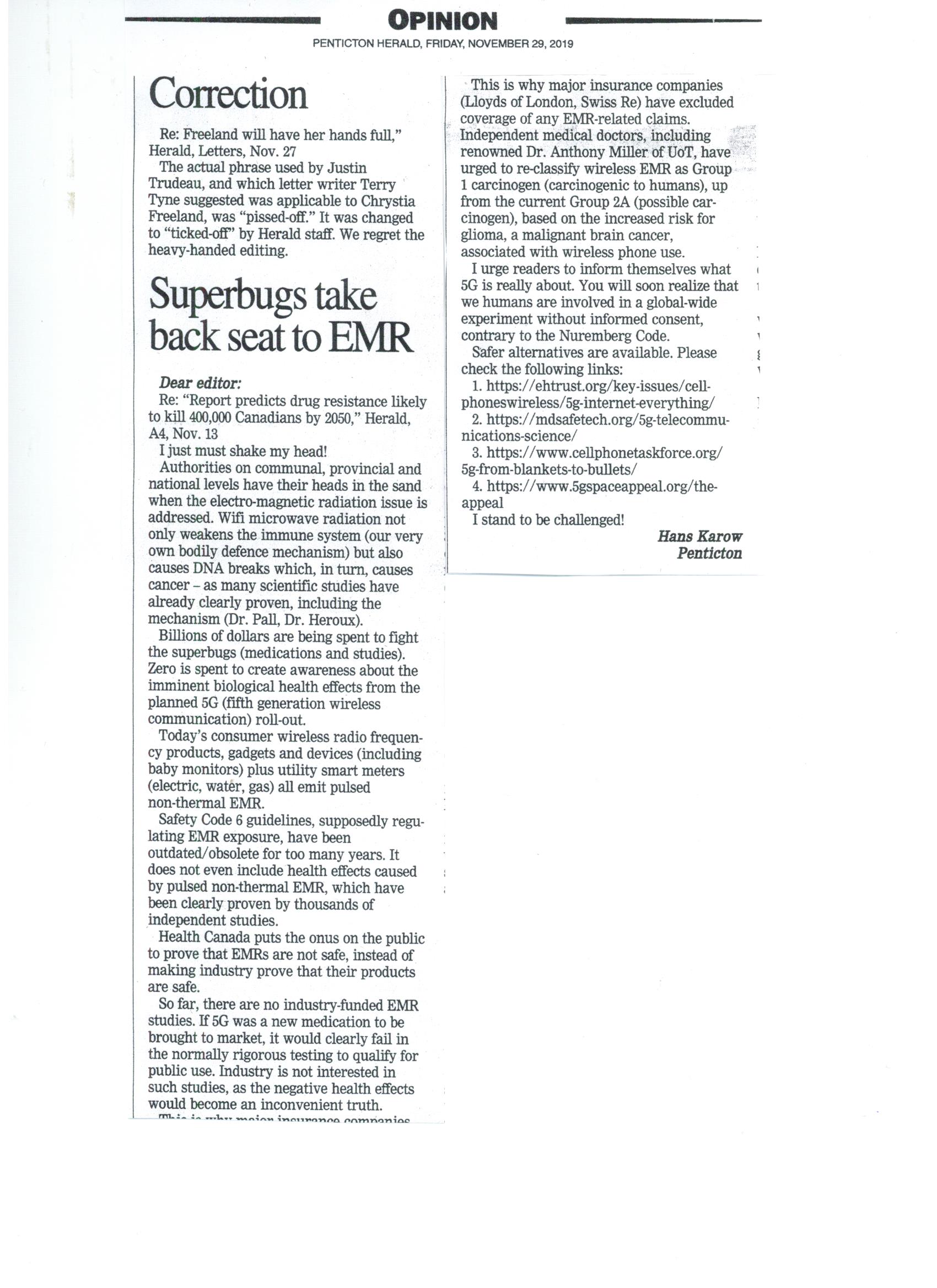 Superbugs take back seat to EMR – Letter to Editor by Hans Karow – Penticton Herald – Nov. 29 2019 2019-11-29 1700 × 2338 Superbugs take back seat to EMR – Letter to Editor by Hans Karow – Penticton Herald – Nov. 29 2019